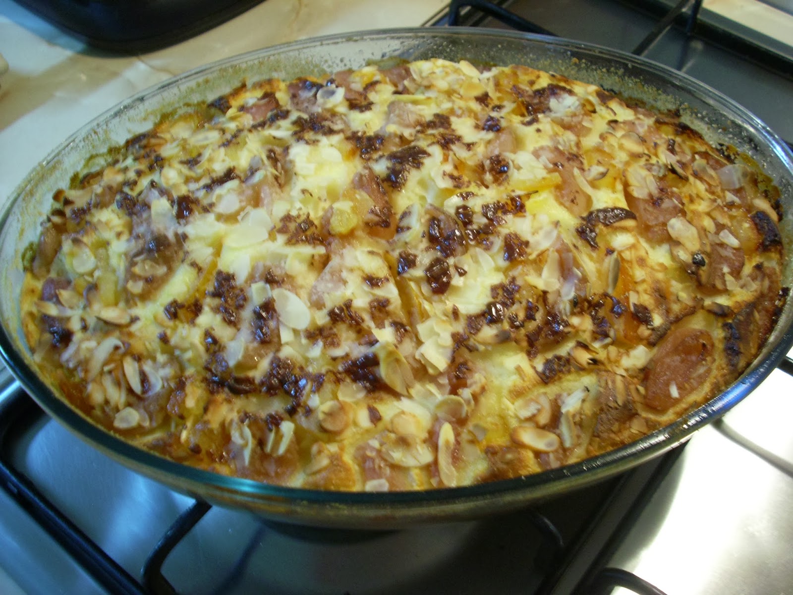 In seara asta, asa de divertisment, am "recidivat'' cu Dulce, sarat? Bun., aluatul cu branza de vaci, dar neavand mere la indemana, am garnisit-o cu piersici din compot, coji de portocale din dulceata si cateva migdale...ramasesera de la bananele coapte si era pacat sa le arunc, nu?